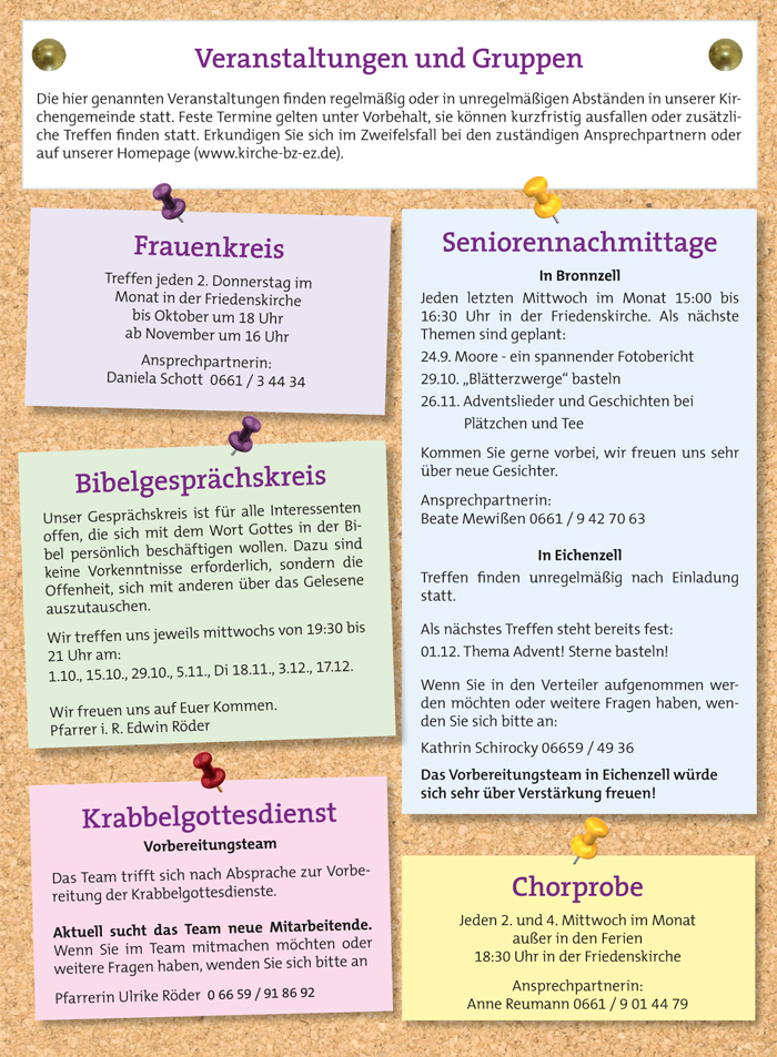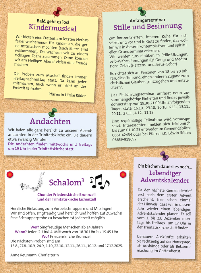 Hier ein aktueller Hinweis: Die Andacht am Sa., 18.10.2025, um 10:15 Uhr in der AWO Eichenzell und der Gottedienst am So, 19.10.2025, um 17 Uhr in der Trinitatiskirche werden entgegen des Plans im Gemeindebrief gehalten von Frau Pfarrerin Ulrike Röder.